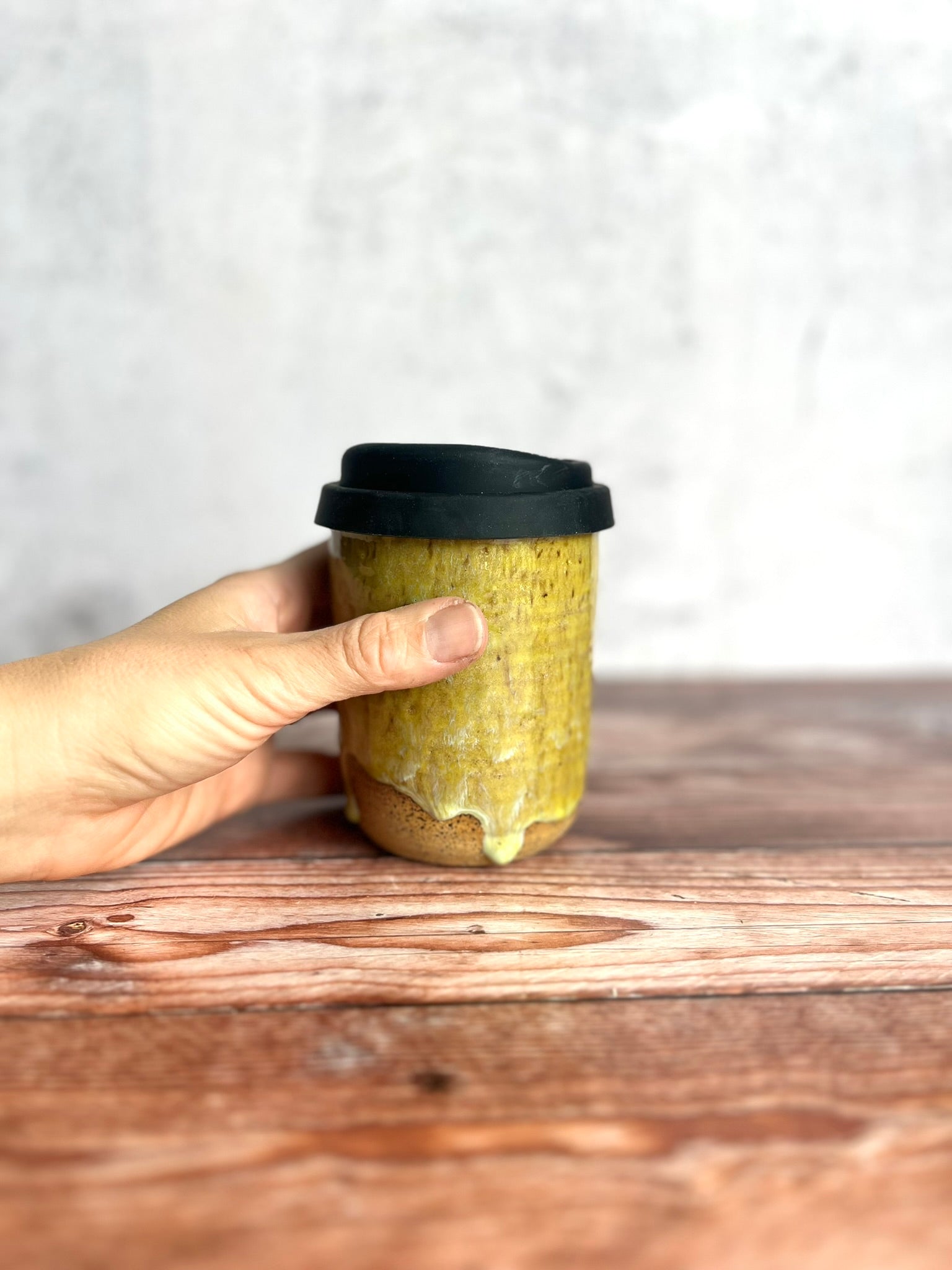 Wheel-thrown stoneware travel cup with silicone lid